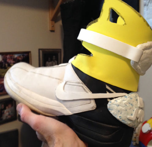 I did the same process for this build but made a few tweaks. I used cloth this time for the inside of the shoes and actually cut out the letters (and swoop) for the NIKE MAGS to be placed on the back of the shoes. I was able to extend the tongue a bit longer on these shoes to make them look a bit more accurate. Unfortunately, because of the wear and tear, the foam straps didn't last too long on these shoes and they fell apart. So I'm not sure if I have any other photos of these shoes before they were worn.