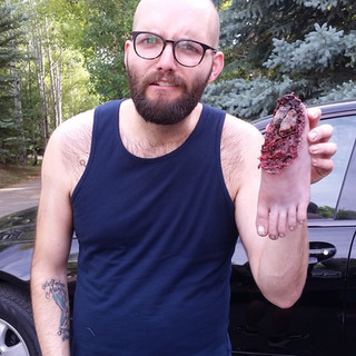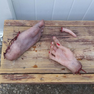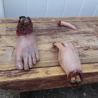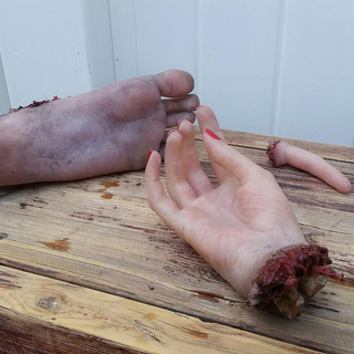 I was tasked with creating some body parts, like fingers, hand, foot (that had been in an explosion), a miniature coffin (for practical effects), a pulpit, and a foam O2 tank replica.